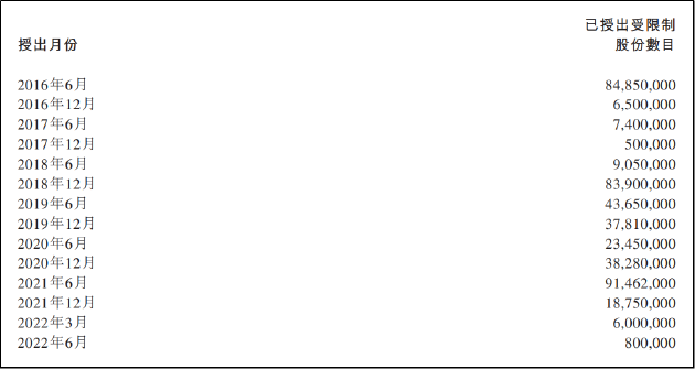 同时,据招股书显示,圆心科技在首次递表前存在授出大额股权激励的现象。截至2020年、2021年、2022年以及2023年6月,圆心科技分别录得以股份为基础的补偿开支人民币5010万元、1.35亿元、8320万元和4020万元,对应授出股份情况如下图所示。