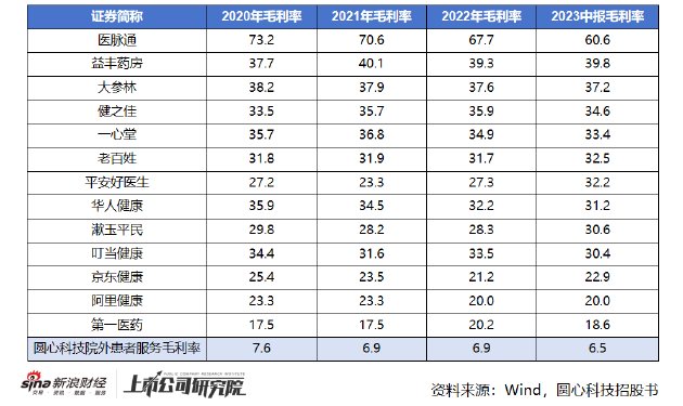 由此可见,圆心科技卖药业务采取的是低价换量策略,利润空间十分有限,这一点从公司持续降低的主营业务毛利率同样有所体现。从业务类型看,“院外患者服务”,即通过线上线下(35.090, 0.24, 0.69%)渠道向患者出售药品的服务营收占据公司总营收的比例基本维持在95%左右,而该项业务在报告期内毛利率持续降低,分别为7.6%、6.9%、6.9%和6.5%,远低于其他药店行业企业平均水平。