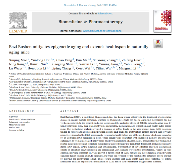 事实上,早在今年6月,以岭药业八子补肾胶囊通过逆转DNA甲基化抗衰老的功效已在科学实验中得到验证,相关学术论文《八子补肾延缓自然衰老小鼠表观遗传衰老并延长其健康寿命》也发表在国际药学领域SCI期刊《生物医学与药物治疗》(Biomedicine & Pharmacotherapy,影响因子7.419)上。