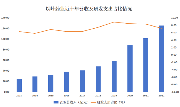 追本溯源,从公司历年的年报数据可以发现,以岭药业能够在各个领域取得成功并非偶然。近十年来,在公司营收保持高速增长的同时,研发支出占比也始终维持高位,远超行业平均水平。