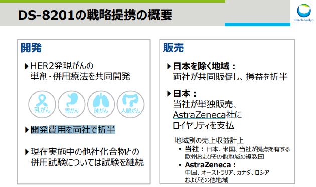 彼时DS-8201治疗HER2低表达乳腺癌已进入关键性全球III期临床研究,并已于2019年1月完成首例患者给药。同时,第一三共在公告中已明确,双方将分别承担产品研发50%的研发费用,这或也是该项合作协议首付款较高的原因之一。