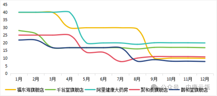 通过对热销店铺同一商品的价格跟踪,部分店铺桑椹干近一年的价格呈下降趋势,其中福东海旗舰店的桑椹干价格降幅最大,达75.1%。