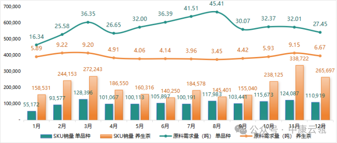 2023年,淘宝天猫平台上架桑椹商品数2034个,SKU总销量144.7万个,其中销量TOP100的SKU销量125.7万个,占比86.83%。另一方面,含桑椹原料的养生茶销量TOP100的商品SKU销量249万个,相对来说,桑椹养生茶产品消费基数更大。