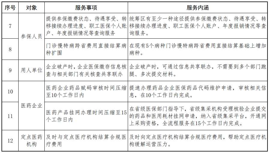 (一)为群众和用人单位提供更便捷服务。推动线下服务“只进一门”,将服务送到群众和企业身边,实现“一站式服务、一窗口办理、一单制结算”。推动异地事项跨域办,优化关系跨地区转移接续等服务,持续完善异地就医直接结算服务。推动线上服务“一网通办”,实现更多医保服务网上办、掌上办、视频办,提高全程网办水平,提供智能化办事引导,实现更多事项“免申即享”。推动诉求“一线应答”,不断提升医保咨询服务接办效率。提高“人性化”服务水平,推动传统服务模式和智能化服务创新并行,缩小服务体验差异,保障不同人群平等享受服务。