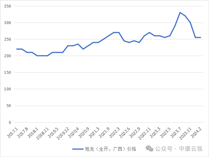 2023年因库存薄弱,地龙价格突破300元,后期受到进口货源冲击,行情出现下滑,目前价格回落到250元附近。