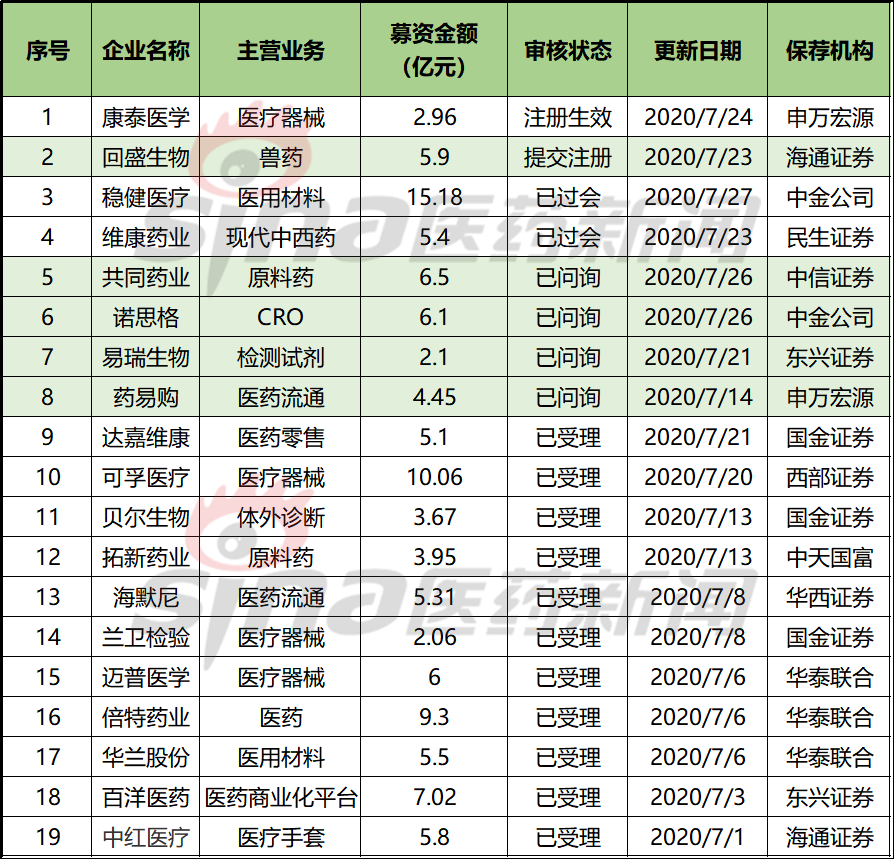 2020年6月12日,证监会发布了《创业板首次公开发行股票注册管理办法(试行)》,正式开启了创业板注册制改革。改革主要有以下几个方面:设置行业负面清单;修改完善审核时限要求,明确“三个月”的时限要求;允许亏损企业上市;明确IPO前5个交易日不设涨跌幅限制,日涨跌幅限制将改为20%;同步放宽相关基金涨跌幅至20%;完善红筹企业上市及退市条件等。目前创业板注册制新规下的审批名单已经陆续出炉,医药制造、流通再次成为备受关注的一个领域。据新浪医药统计,截止目前,共有19家医药制造、流通企业IPO获受理,总共募资金额超112亿元。其中进程最快的为康泰医学,是首批创业板注册生效的企业,有望最快上市。除此以外,稳健医疗、维康药业已经过会,进程领先。
