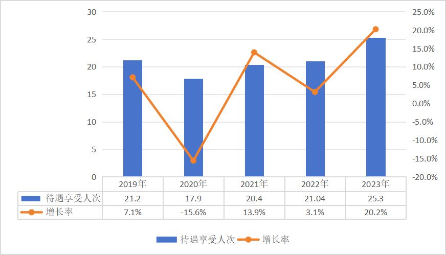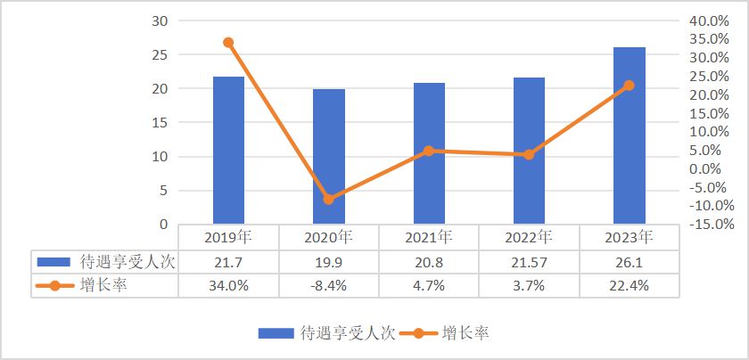 3.待遇享受。2023年职工参保人员待遇享受人次较快增长,达25.3亿人次,比上年增长20.2%。其中,普通门急诊21.8亿人次,门诊慢特病2.7亿人次,住院0.8亿人次。此外,享受药店购药23亿人次。