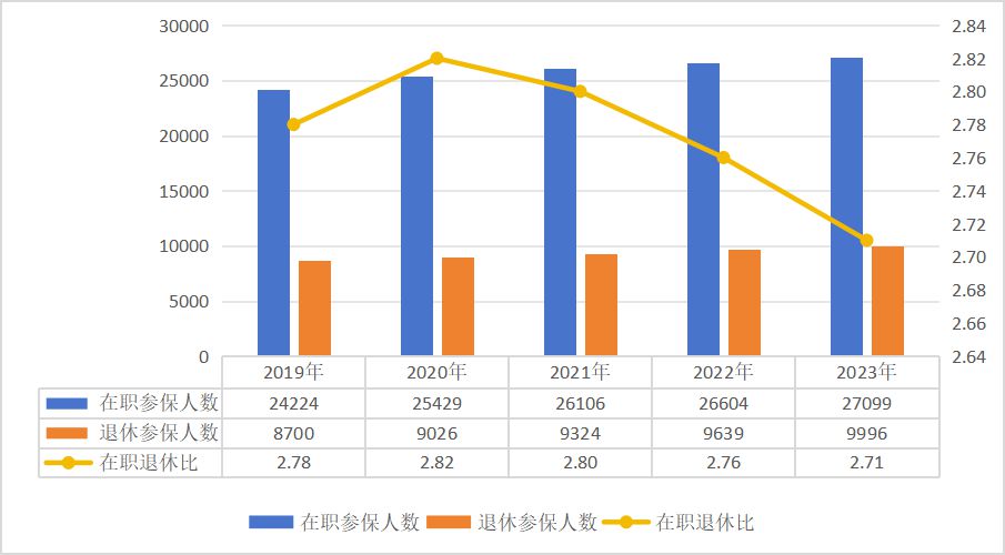 1.参保人数。截至2023年底,职工医保参保37095万人,比上年增加852万人,增长2.3%,其中,在职职工27099万人,比上年增长1.9%;退休职工9996万人,比上年增长3.7%,在职退休比为2.71。