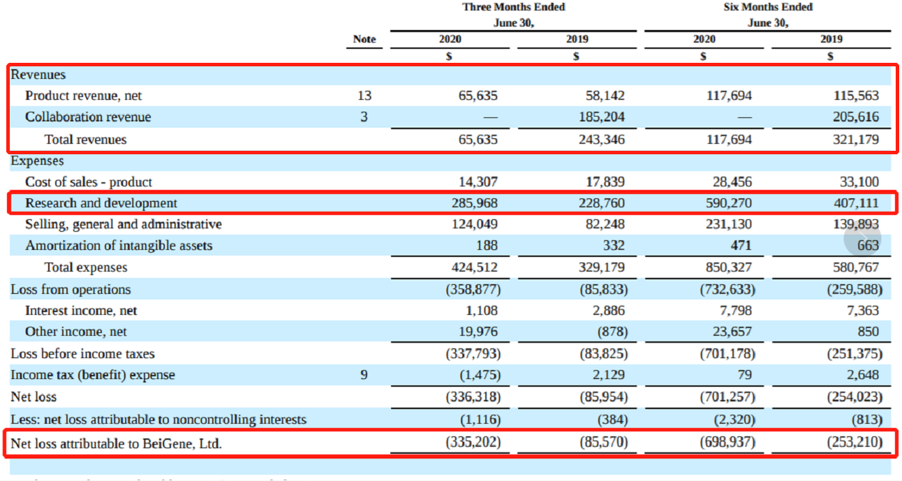 总收入锐减的同时,百济神州上半年的产品收入较去年同期有所增长,特别是2020年第二季度产品收入6564万美元,创下历史新高。对此百济神州联合创始人、首席执行官兼董事长欧雷强(John V. Oyler)表示,增长“主要来自于我们近期上市的自主研发产品。”此外,今年上半年百济神州继续延续亏损,达到6.99亿美元,而2019年同期的数字为2.53亿美元。2020年上半年百济神州的收入全部是由旗下产品支撑的,特别是第二季度百泽安在华以及百悦泽(BRUKINSA,泽布替尼)在华及在美不错的销售成绩创下了产品收入新高。欧雷强在财报公告中表示,百济神州的产品“在第二季度开始以来取得了巨大的进步,百泽安和百悦泽的三项适应症在中国获批;在中国、欧盟、澳大利亚和以色列相关百泽安、百悦泽及帕米帕利( pamiparib)相关的八项新药上市申请被受理。”其中,备受关注的PD―1产品替雷利珠单抗注射液百泽安在上半年实现销售收入4994万美元,约合3.5亿人民币。百泽安于2019年12月底正式在国内获批,今年上半年逐渐开始放量。4月第二个适应症获国家药监局批准,第二季度国内销售2942万美元贡献了百济神州Q2产品收入的45%。作为国内6款PD-1单抗产品中最后一个获批的,与前辈相比替雷利珠单抗显然没有抢占到市场先机。国内PD-1单抗市场“4+2”格局竞争激烈,两款进口产品虽未公布在中国市场的具体销售成绩,但其实力在全球的销售中可见一斑。BMS的O药Opdivo于2014年上市首年销售额就达到9.42亿美元,2018年更成为全球销售额排名首位的PD-1药物,销售额为67.35亿美元。2020年上半年虽然销售下滑6%,O药在全球仍卖出34.19亿美元;上市时间稍晚默沙东的K药Keytruda2014年首年销售额5.66亿美元,2019年的销售额更是突破百亿美元大关。2020年上半年K药全球销售额高达66.72亿美元。另一方面,国产PD-1虽然上市时间晚、获批适应症少,销售成绩无法匹敌进口产品,但市场表现同样强劲。作为唯一一款进入医保的PD-1产品,信达生物的信迪利单抗2019年上市首年销售额10.16亿元,2020年上半年销售收入1.21亿美元,合8.5亿元人民币;君实生物的特瑞普利单抗2019年上市首年的销售额为7.78亿元,2020年第一季度的销售收入约为1.72亿元;恒瑞医药并没有公布卡瑞利珠单抗2019年具体的销售收入,但业界估计其上市首年销售额不会小于10亿元。不过从上市首年的放量速度上来看,替雷利珠单抗在国产PD-1中的表现突出。君实生物的特瑞普利单抗于2018年12月份获批上市,2019年2月正式上市销售,2019年上半年的销售额为3.09亿元。信达生物信迪利单抗于18年12月份获批上市,2019年3月正式开始销售2019年上半年销售额约3.32亿元人民币。百济神州第一款自主研发产品,泽布替尼于2019年11月被美国FDA批准上市,成为首个获得FDA“突破性疗法”认定并批准上市的抗癌创新药。2020年6月在中国获批上市。今年上半年在中美销售额合计769.1万美元。除了自主产品开始发力,百济神州另外两款代理自新基的产品市场表现同样稳健。瑞复美(REVLIMID,来那度胺)、维达莎(VIDAZA,阿扎胞苷)上半年合计销售额为2901万美元,相比去年同期增长23%。不过,受2020年3月停销及产品召回影响,同样代理自新基的ABRAXANE2020年Q2销售收入仅为24万美元,而2019年同期其销售额为3473万美元。这三款产品在中国的独家授权是百济神州于2017年7月以13.93亿美元从新基购得。除了ABRAXANE销售受挫外,百济神州上半年收入锐减的最主要原因是与新基公司终止替雷利珠单抗合作后不再获得相应的合作收入。2019年上半年,百济神州获得的合作收入高达2.05亿美元。2017年百济神州和新基展开战略合作,百济神州获得新基三款产品在中国的销售权,新基取得替雷利珠单抗除亚洲之外的全球授权,并向百济神州支付合作费用,但2019年BMS以740亿美元收购新基公司中断了这场合作。2019年6月百济神州宣布与新基公司达成共识,在BMS完成对新基公司的收购前,终止双方关于百济神州在研抗PD-1抗体替雷利珠单抗的全球合作,新基向百济神州支付了1.5亿美元。这1.5亿美元的“分手费”直接反映在百济神州2019年财报中,2019年年度收入暴增1.16倍。但由于毕竟只是一次性收入,“分手”后的百济神州暂时无法填补合作收入缺失造成的空白。虽然收入大幅减收,但百济神州却在研发投入上继续加码。早在2018年百济神州就凭借6.79亿美元的研发投入超越恒瑞医药成为国内最烧钱的本土制药企业。今年上半年,百济神州为研发共投入了5.90亿美元,较去年同期的数字4.07亿美元增长45%。此前百济神州曾被海外做空机构以研发支出过高、虚增收入为名做空。在此次半年报中,百济神州披露截至2020年6月30日其持有现金、现金等价物、限制性现金和短期投资余额为 31.6 亿美元,并且不包括于7月15日完成的约为20.7 亿美元的注册直接发行收入。2019年底这个数字为9.86亿美元。大量现金储备是百济神州加码研发的底气。欧雷强表示,这笔资金将“丰富现有管线,进一步拓展肿瘤及其他疾病领域的产品组合。”