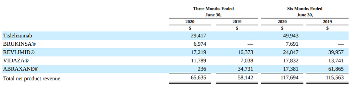 8月7日,百济神州公布了2020年上半年的财务业绩以及公司近况。截至2020年6月30日,百济神州上半年共实现营收1.17亿美元,较去年同期下降63%。财报中披露,此次收入同比大幅下降“主要归因于自2019年6月与新基公司终止百泽安(tislelizumab,雷利珠单抗)合作协议后缺少合作收入,以及自2020年3月国家药监局暂停ABRAXANE在中国销售以及产品召回后的销售减少。”