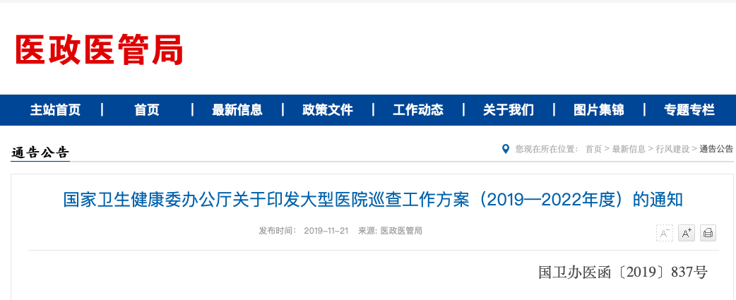 新一轮大型医院巡查,自2019年11月启动,于2022年6月底前完成。国家卫健委负责委属委管医院巡查工作,接受巡查的原则上为二级以上公立医院,每所医院巡查天数原则上不少于7天。方案要求,针对大型公立医院的巡查要围绕热点问题,重点巡查医疗卫生行风建设“九不准”落实情况。比如:是否有加强监管、杜绝医师在药品处方、医学检查、检验等医疗服务中实行开单提成的具体措施;是否存在医疗卫生技术人员违反规定私自采购、销售、使用药品、医疗器械、医用卫生材料等医药产品的问题;是否有对违反规定私自采购销售、使用药品、医疗器械、医用卫生材料等医药产品的人员的处理办法;是否对医院内部人员与医药相关企业间接触作出了细致具体、便于查验的管理办法。今年1月10日,2020年全国医疗管理工作会议召开,明确提出今年要在“树立风清气正的行业作风上狠下功夫”。有分析指出,随着疫情防控工作进入后期,各大医院的业务也在回暖,医院的门诊量开始回升,医疗服务领域的行风建设和医院巡查整改工作将步入正轨。