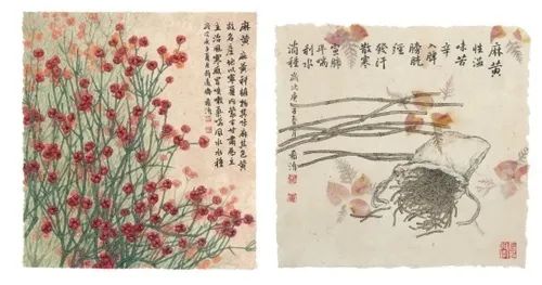 42幅《清肺排毒汤中草药图》系列作品。 董希源表示,该系列作品的创作灵感最早产生于今年2月。当时,全国上下团结一心抗击新冠肺炎疫情,数以万计的白衣战士冲锋在抗疫一线,他们无私无畏的精神激励和感动着全国人民。每天浏览相关新闻,董希源内心深处都会涌起一股热流,他渴望着用手中的画笔为抗击疫情做出应有的贡献。从小对中医怀有敬畏之心的他注意到,2月6日,国家卫生健康委办公厅、国家中医药管理局办公室印发《关于推荐在中西医结合救治新型冠状病毒感染的肺炎中使用“清肺排毒汤”的通知》,该方随后被纳入第六版、第七版新冠肺炎诊疗方案,并作为治疗轻型、普通型、重型、危重型通用方剂推荐使用。“我国首先取得抗击新冠肺炎疫情阶段性重要成果,为世界和人类的健康事业再一次做出巨大贡献,其中,中医药起到显著作用。据统计,我国90%以上确诊病例曾接受中医药治疗。而国家中医药管理局发布的‘清肺排毒汤’更是发挥了重大而极其有效的作用,获得了全社会的赞誉与普遍好评。”董希源说。 他认真研究“清肺排毒汤”以及相关资料后发现,这剂药方是由21味中药组成,其中茯苓、生姜、山药、柴胡等均是常见的中药,却产生了神奇的抗疫疗效。瞬间,一个想法油然而生:“我想把这些中药用毛笔描绘出来,将中医和国画两种国粹进行完美融合,用艺术的方式弘扬中医药的价值。” 中药材麻黄的原生态和成品状态。 从幼时起就学习中国传统书画艺术的董希源,对一脉相传的中医药文化并不陌生,他说,中国画所用材料中,如颜料和纸,不乏与中药同根同源。此次系列作品用纸,他更是刻意选择了非物质文化遗产——新疆和田的桑皮纸,而桑本身也是多种中药的来源。 “4个多月的辛勤创作,使42幅作品得以圆满收工,我非常欣慰和兴奋。”董希源表示,除了为抗击疫情中发挥作用“清肺排毒汤”立传,他更希望能以自己手中的笔,用自己所擅长的传统书画艺术为中医药事业的传承和传播做一些力所能及的贡献。“习近平总书记指出,‘中医药是中华民族的瑰宝,一定要保护好、发掘好、发展好、传承好’。传承和传播中医药,我们人人有责。下一步,我会带着这些作品在国内、国外展出,不只是为了艺术,更为了社会责任。我希望更多的人认识这些了不起的中药材,了解并加入中医药事业的传承和传播事业中来。”