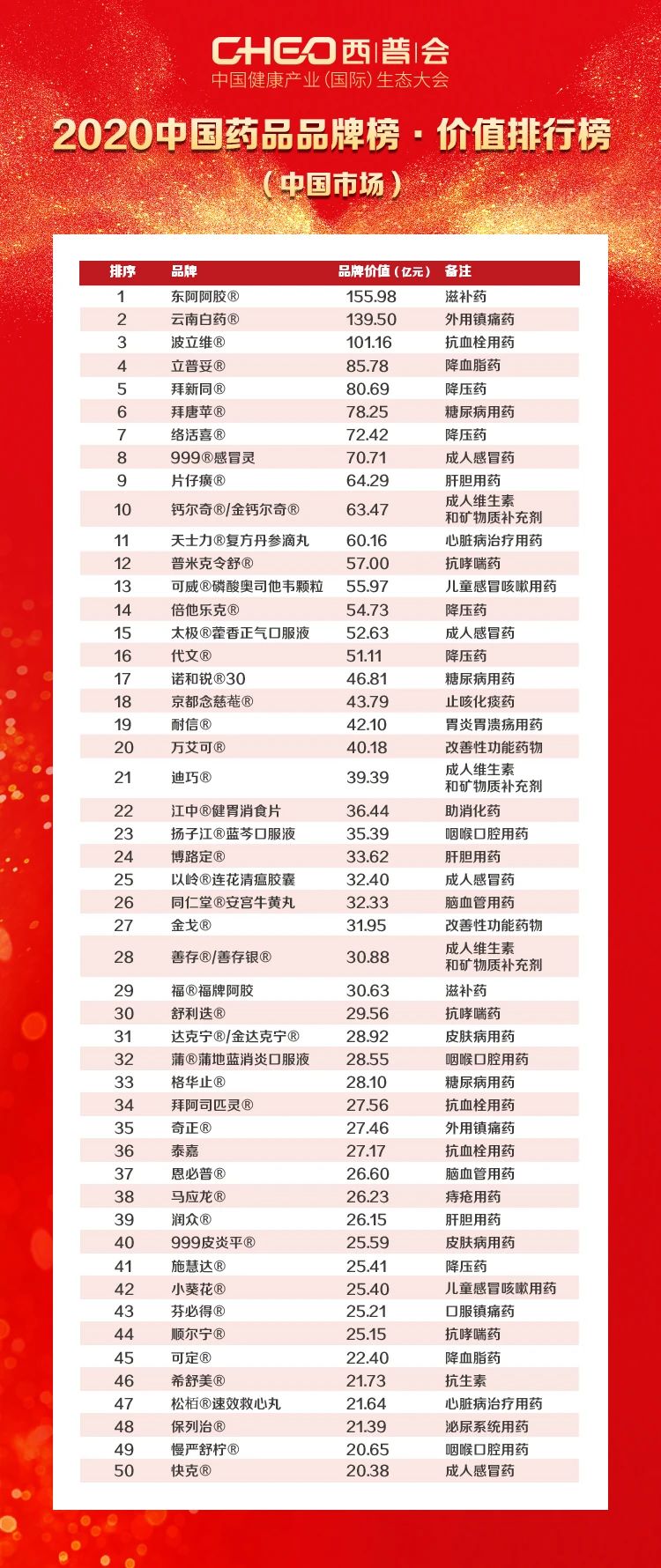 8月14日,中康研究院于西普会上隆重发布2020中国药品品牌榜•价值排行榜。Top50品牌价值再创历史新高,上榜品牌价值榜最低门槛超20亿元!