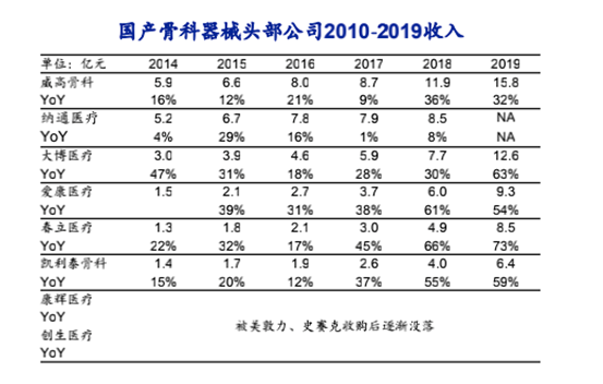 在骨科器械这一细分市场,国产器械则已经长期霸占市场。数据显示,自2014年以来,头部国产骨科公司有威高、纳通、大博、爱康、凯利泰、春立,到2019年头部骨科器械公司基本仍在头部。其中,春立医疗(港股)股价更是实现了2年10倍幅。2019年,春立医疗收入为8.55亿元,营业收入同比增长71.78%。春立医疗专注于骨科植入物市场,特别是关节类产品。