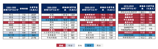 对于头部器械企业来说市场空间巨大。2019年我国医疗器械上市TOP10企业营还远小于当年全球医疗器械龙头美敦力一家的营收2111亿元。如果以成熟度较高的美国本土A股市场来看,美股过去40年,从1980年至今,医药行业涨幅前10的公司中,涌入的器械公司从1家变为5家。2010年-2020年医药涨幅前10 的公司中诞生了精密科学、德康医疗、阿比奥梅德、爱齐公司等牛股。