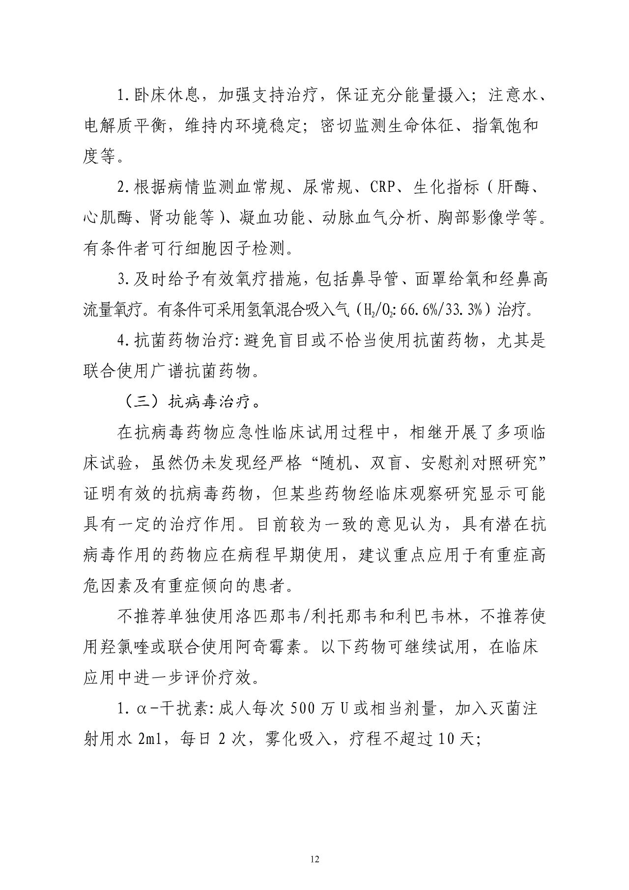 α-干扰素、利巴韦林(建议与干扰素或洛匹那韦/利托那韦联合应用)、磷酸氯喹、阿比多尔可继续试用,在临床应用中进一步评价疗效及不良反应、禁忌症以及与其他药物的相互作用等问题。不建议同时应用3种以上抗病毒药物。
