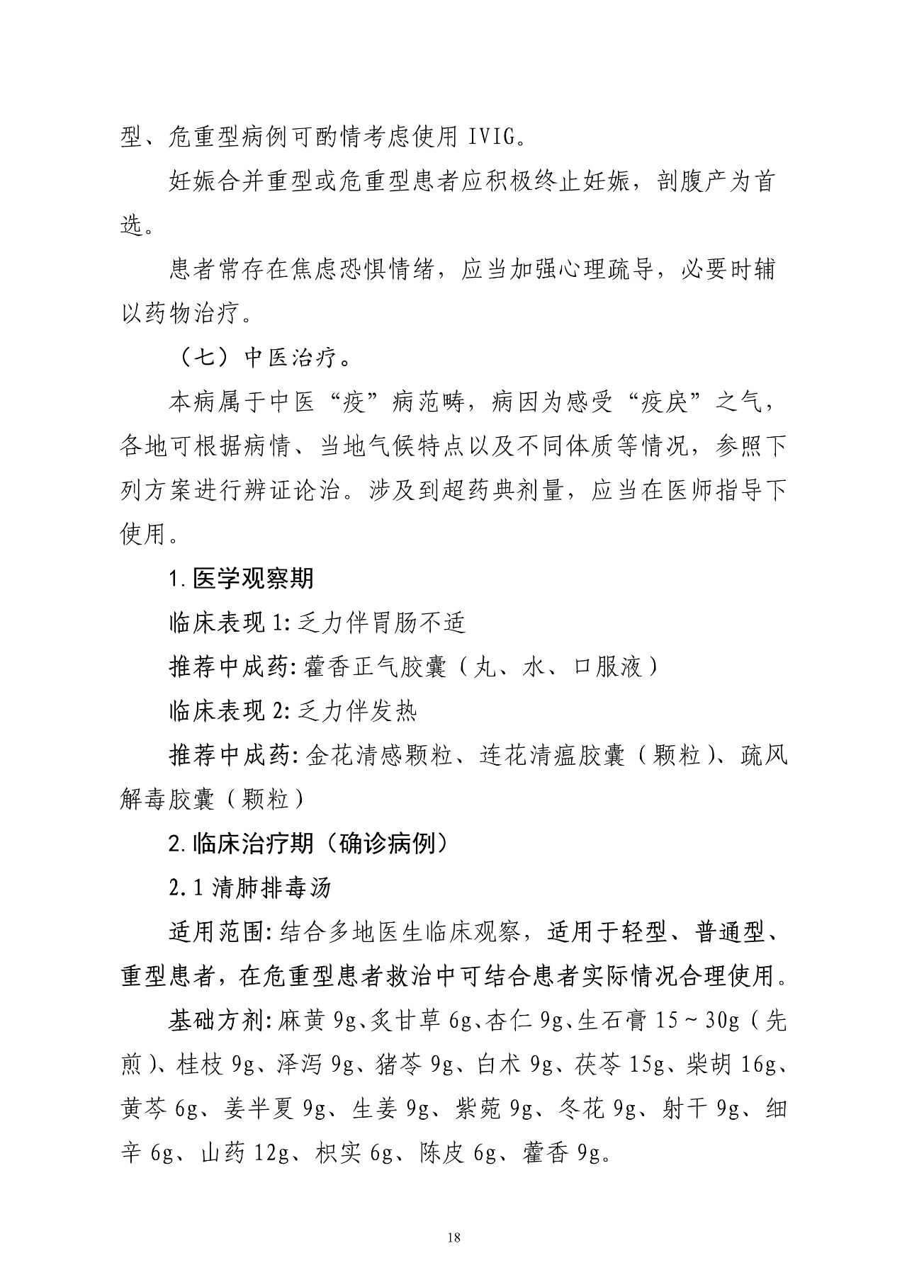 推荐处方:化湿败毒方 基础方剂:生麻黄 6g、杏仁 9g、生石膏 15g、甘草 3g、藿 香 10g (后下)、厚朴 10g、苍术 15g、草果 10g、法半夏 9g、 茯苓 15g、生大黄 5g (后下)、生黄芪 10g、葶苈子 10g、赤芍 10g。