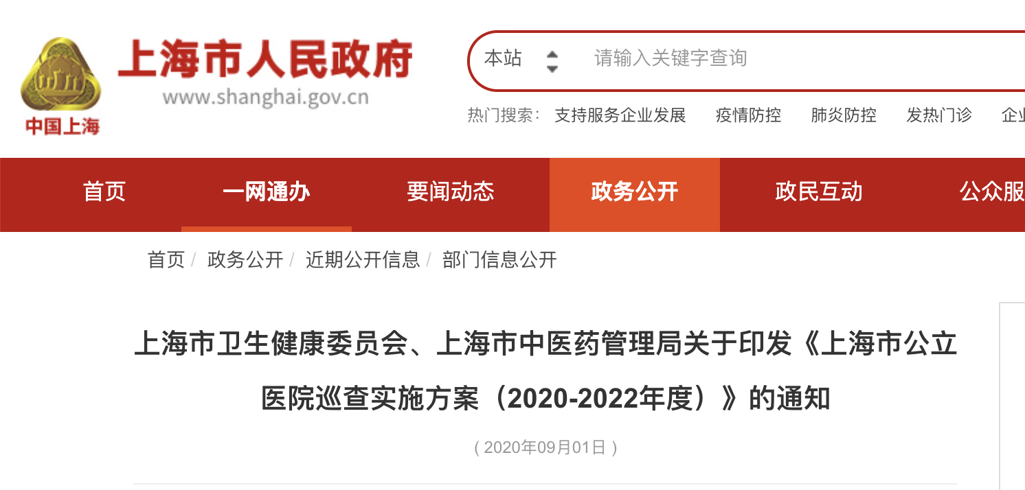 昨日(9月1日),上海市人民政府发布《上海市公立医院巡查实施方案(2020-2022年度)》。