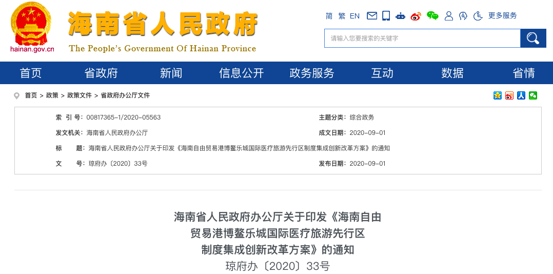 附:海南自由贸易港博鳌乐城国际医疗旅游先行区制度集成创新改革方案
