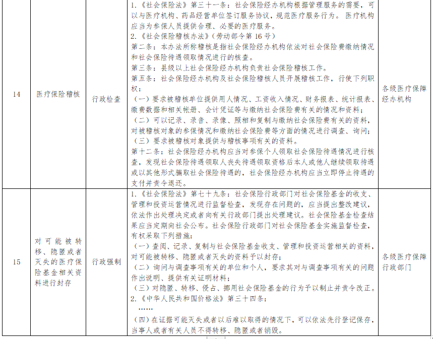 据梳理,指导目录共涉及15项内容,分为事项名称、职权类型、实施依据和实施主体4大部分。在15项内容中,7项为行政检查,6项为行政处罚,还有2项分别为其他行政职权和行政强制。中国医疗保险在文章中指出,行政执法是行政机关履行政府职能、管理经济社会事务的重要方式, 行政执法公示是保障行政相对人和社会公众知情权、参与权、表达权、监督权的重要措施。《指导目录》对各地医保部门行政执法的权责进行了明确规定,尤其是给出了明确的法律依据,有望在很大程度上解决地方医保部门行政执法中的遇到的困难,提升医保行政执法的权威性。