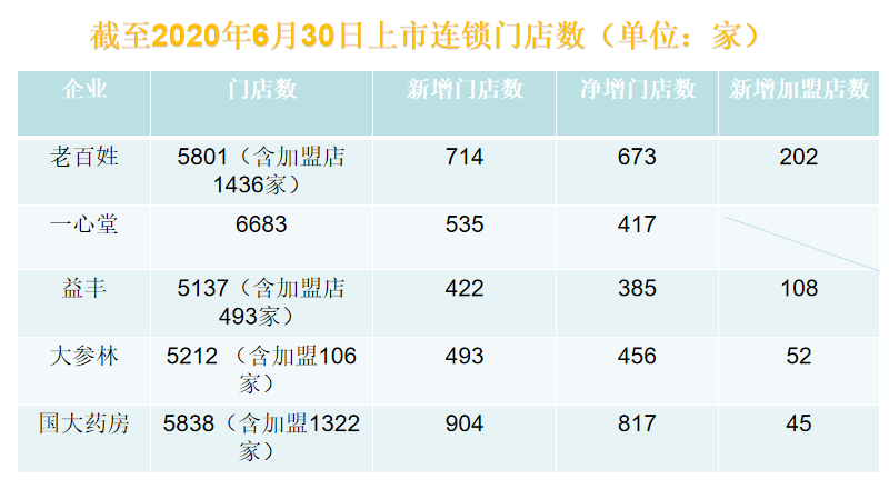 从上表可知,国大药房新增门店数和净增门店最多,老百姓次之。具体来看,国大药房新增门店主要布局在北部地区,仅北部地区直营门店就增加了646家;老百姓新增门店主要布局在华中、华东等具有规模优势区域,其中华中新增门店266家,华东新增门店133家;新增并购94家门店中,亦主要集中在规模优势省份,分别为湖南48家、安徽20家、山西14家、江苏12家。直营门店稳步增长的同时,老百姓加盟增速略有放缓,新增加盟店202家,分析认为与疫情有关。尽管如此,老百姓2020半年报透露,报告期内实现配送收入4亿元,同比提升74.67%,加盟业务具有资产轻、扩张快、净资产收益率高、抗风险能力强等优势,有望为老百姓持续贡献增量业绩。华创证券分析认为,老百姓门店数量稳步增长,布局向优势区域集中,随着老百姓省份聚焦战略继续执行,规模效应、经营效率有望持续提升。与老百姓加盟增速略有放缓相反,益丰和大参林2020上半年加盟业务推进速度在加快,其中益丰新增加盟店108家,与2019年增速基本持平;大参林新增加盟店52家,接近2019年整年新增加盟店数量(54家)。加盟业务增速的同时,益丰和大参林直营店的增长也稳步增长。2020上半年,益丰新增直营门店269家,大参林新增直营门店439家。益丰2020半年报透露,公司始终坚持直营为主的营销模式,区域开拓以“巩固中南华东,拓展全国市场”为发展目标,立足于中南华东华北市场,在上述区域密集开店,形成旗舰店、区域中心店、中型社区店和小型社区店的多层次门店网络布局,深度耕耘区域市场,通过深度扩展和品牌渗透,逐步取得市场领先优势。一心堂始终坚持直营经营模式。2020上半年,一心堂新开业门店535家,大部分集中在云南、四川、重庆、贵州等西南地区。一心堂2020半年报也透露,一心堂以西南为核心经营地区、华南为战略纵深经营地区、华北为补充经营地区格局。报告期内,一心堂继续深耕川渝、桂琼、山西三个重点突破区域,通过自建和零散收购的方式深入拓展,持续优化门店布局、商品结构,提升一心堂在当地的品牌影响力,进而提升销售能力及盈利能力。2020年1-6月,云南省以外区域门店销售收入同比增速达到25.31%,高于公司合并报表口径的营收增速。