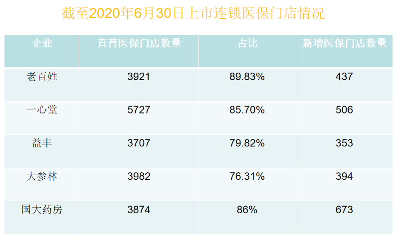 从上市连锁直营医保门店数量情况能印证其扩张策略。2020年上半年,上市连锁医保门店数量均保持稳步增长。