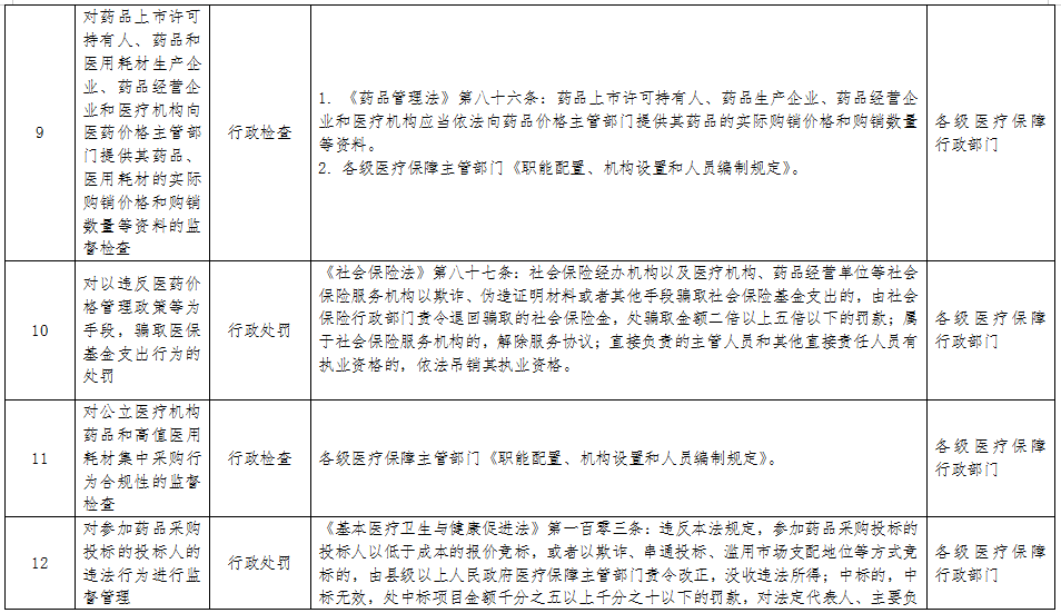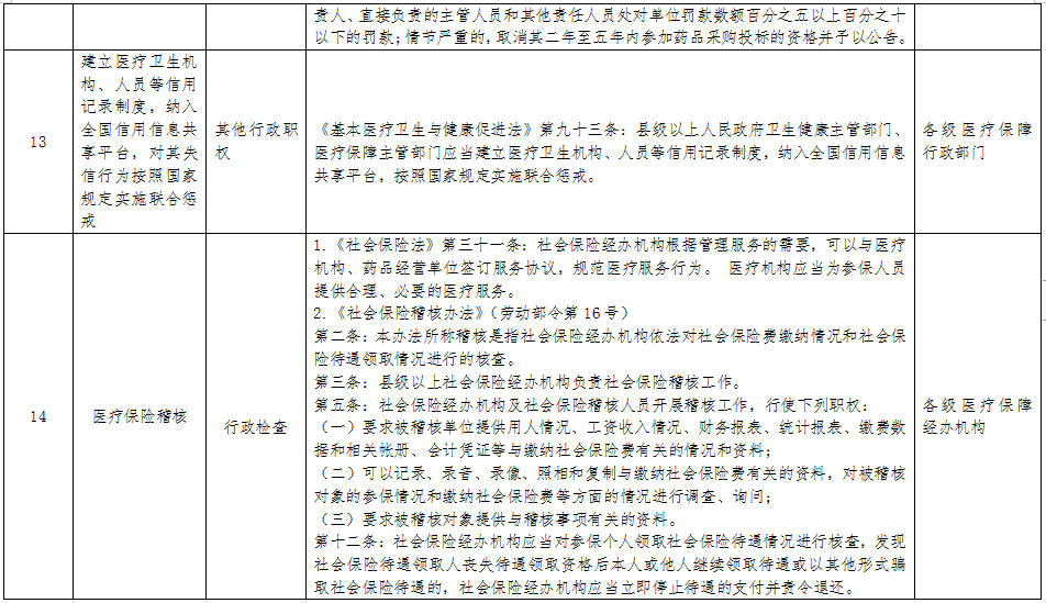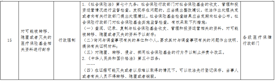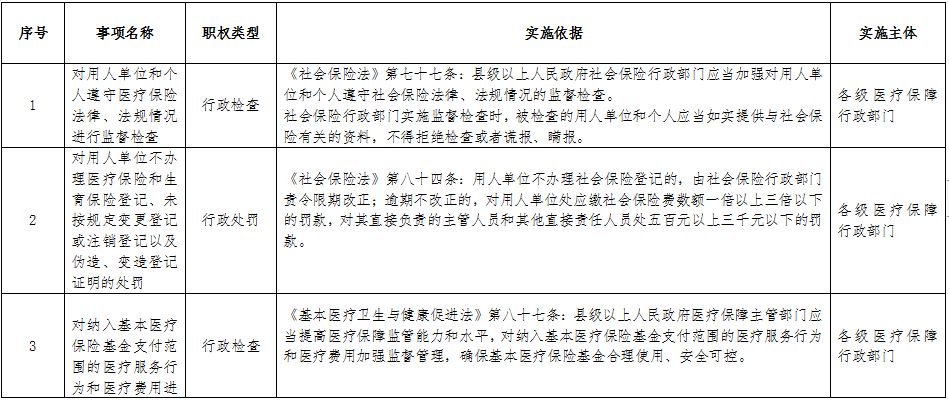 《目录》列举了15类行政执法事项,涉及医疗机构、药品经营单位、参保单位、参保人员等,实施主体为各级医疗保障行政部门。