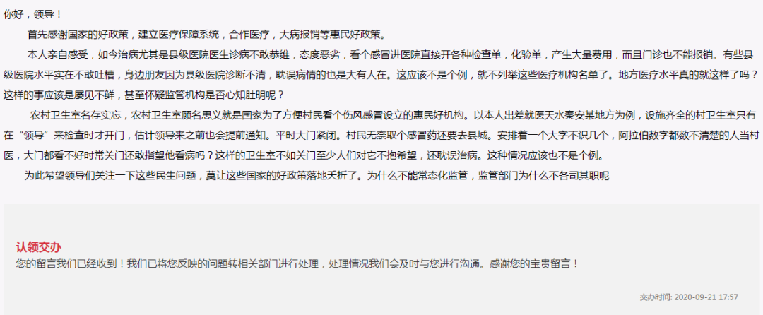 这些年国家医改一直强调“强基层”,要加强基层医疗服务能力,壮大基层医生队伍。经过多年的发展,可以说“强基层”取得了一定的成绩,但是在老百姓看来,离他们的要求还相距甚远,于是就经常会有一些人在网上给领导留言,表达他们的不满或者是诉求。