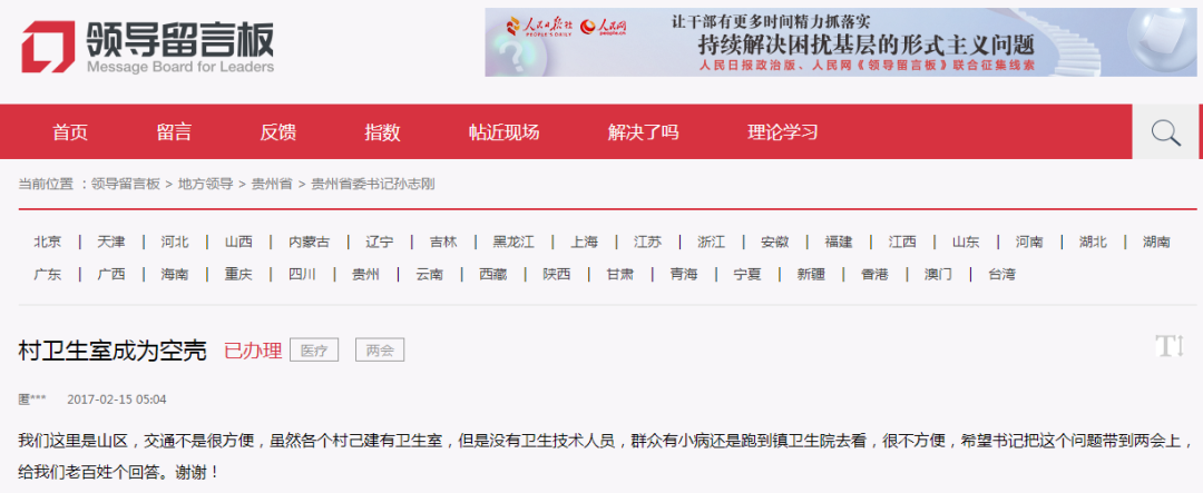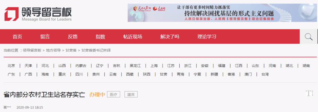 近日,在人民网【领导留言板】上,有读者给甘肃省省委书记留言“省内部分农村卫生站名存实亡”。(如下截图)