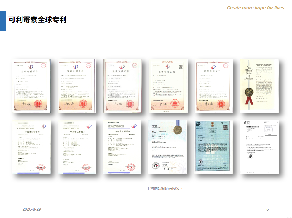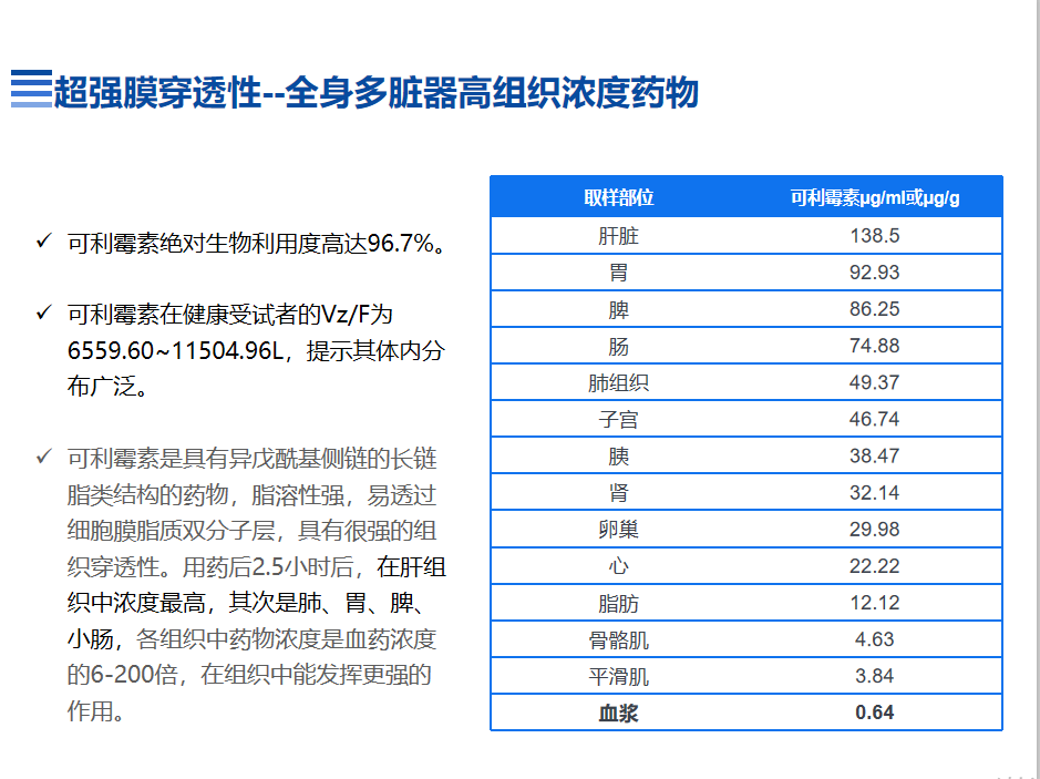 #1 可利霉素-抗新冠肺炎临床研究 实验证明:可利霉素显著降低C反应蛋白,快速改善肺部炎症。 #2 可利霉素全球专利 可利霉素获取12项全球专利 # 可利霉素药代数据 可利霉素:药效达峰时间短,半衰期长,组织分布广泛。 #4 可利霉素生物利用度高达96.7% 可利霉素-超强膜穿透性,全身脏器高组织药物浓度。 #5 可利霉素6大适应病症
