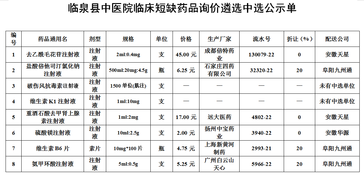根据临泉县中医院2020年9月17日发布的《临泉县中医院临床短缺药品询价遴选公告》,经抽取评委评审,现将评审结果进行公示: