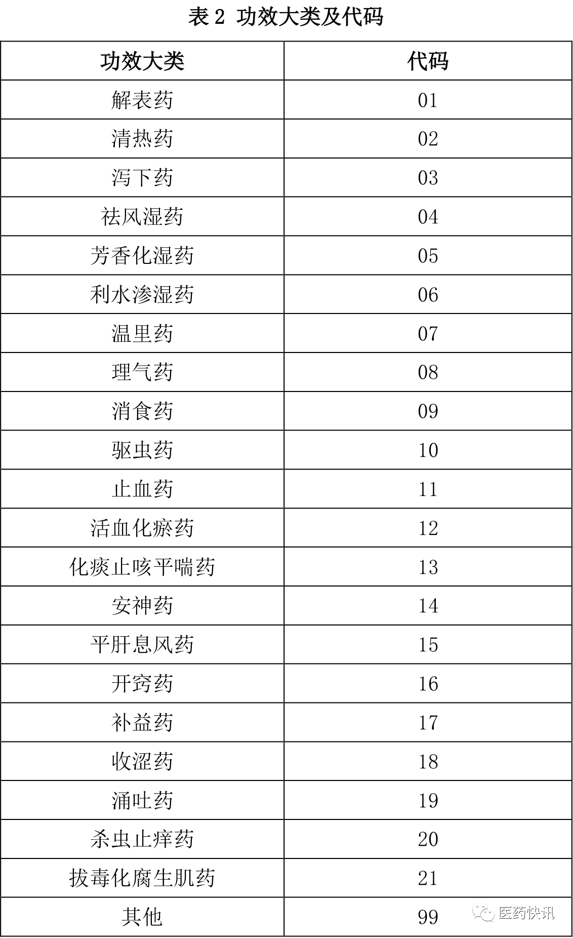 第3部分:功效分类码,根据中药功效大类划分,用2位阿拉伯数字表示。功效分类及代码见表2。