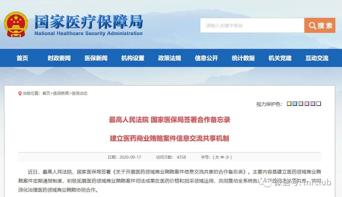9 月 17 日,国家医保局发布消息,最高人民法院、国家医保局签署《关于开展医药领域商业贿赂案件信息交流共享的合作备忘录》。主要内容是建立医药领域商业贿赂案件定期通报制度,积极拓展医药领域商业贿赂案件司法成果在医药价格和招采领域运用,共同推动全系统各层级开展信息交流共享,持续深化治理医药领域商业贿赂协同合作。