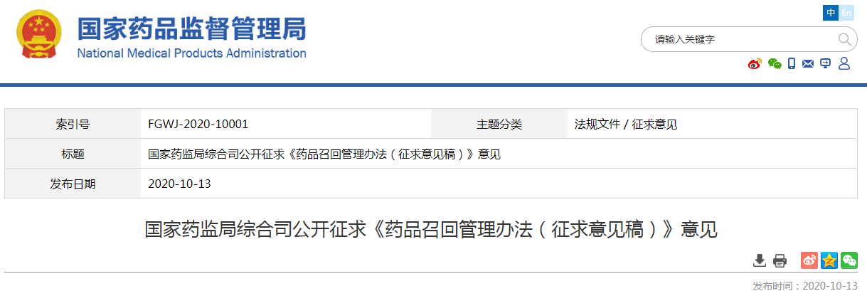 为贯彻落实《中华人民共和国药品管理法》《中华人民共和国疫苗管理法》等法律法规,国家药品监督管理局修订了《药品召回管理办法(征求意见稿)》,现向社会公开征求意见。请于2020年10月30日前,将有关意见通过电子邮箱反馈至ypjgs@nmpa.gov.cn,邮件标题请注明“药品召回管理办法意见反馈”。第一条【目的与依据】 为加强药品质量监管,保障公众用药安全,根据《中华人民共和国药品管理法》《中华人民共和国疫苗管理法》《中华人民共和国药品管理法实施条例》《国务院关于加强食品等产品安全监督管理的特别规定》等法律法规,制定本办法。第二条【适用范围】 中华人民共和国境内上市药品的召回及其监督管理,适用本办法。第三条【召回定义与实施主体】 本办法所称药品召回,是指药品上市许可持有人按照规定程序收回已上市存在缺陷的药品,并采取相应措施,控制消除缺陷的活动。第四条【缺陷药品定义】 本办法所称缺陷药品,是指由于研发、生产、销售、储运、标识等原因导致存在质量问题或者其他安全隐患的药品。第五条【监管部门职责分工】 国家药品监督管理局负责指导全国药品召回的监督管理工作。省、自治区、直辖市药品监督管理部门负责本行政区域内药品上市许可持有人药品召回的监督管理工作。其他县级以上地方人民政府药品监督管理部门负责配合、协助做好药品召回的有关工作。第六条【持有人召回的义务】 药品上市许可持有人是控制与消除药品缺陷的责任主体,应当主动对缺陷药品实施召回。药品上市许可持有人应当建立并完善药品召回制度,收集药品安全的相关信息,对可能存在缺陷的药品进行调查、评估,及时召回缺陷药品。进口药品凡涉及在境内实施召回的,境外药品上市许可持有人指定的在中国境内的企业法人应当按照本办法的规定组织实施。仅在中国境外实施药品召回且不涉及境内药品品种、批次的,药品上市许可持有人指定的在中国境内企业法人应当于境外召回启动5个工作日内,将有关信息报告所在地省、自治区、直辖市药品监督管理部门。第七条【生产经营使用单位配合召回义务】 药品生产企业、药品经营企业、医疗机构应当积极协助药品上市许可持有人对缺陷药品进行调查、评估,主动配合药品上市许可持有人履行召回义务,按照召回计划及时传达、反馈药品召回信息,控制和收回缺陷药品。第八条【生产经营使用单位主动发现药品缺陷】 药品生产企业、药品经营企业、医疗机构发现其生产、经营、使用的药品可能是缺陷药品的,应当立即停止生产、销售或者使用,及时通知药品上市许可持有人或者供货商,并向所在地药品监督管理部门报告,通知和报告的信息必须真实。药品经营企业、医疗机构所在地县级以上地方人民政府药品监督管理部门收到报告后,应当逐级上报至省、自治区、直辖市药品监督管理部门。第九条【建立追溯制度的要求】 药品上市许可持有人、药品生产企业、药品经营企业和医疗机构应当按规定建立并实施药品追溯制度,保存完整的购销记录,保证上市药品可溯源。第十条【召回信息纳入年度报告】 药品上市许可持有人应当将药品召回的情况在药品年度报告中提交。第十一条【信息公开要求】 药品上市许可持有人应当制定药品召回信息公开制度,并通过企业官方网站,主动公布存在缺陷的药品信息和召回情况。境外药品上市许可持有人实施召回的应当在企业中文网站或者指定的中国境内企业法人官方网站主动公布存在缺陷的药品召回信息。没有官方网站的,应在全国性媒体或者所在地省级媒体上发布。第十二条【缺陷药品调查评估】 药品上市许可持有人应当主动收集、记录药品的质量问题或者安全隐患、药品不良反应信息,对收集的信息进行分析,对可能存在的缺陷进行调查和评估。药品生产企业、药品经营企业、医疗机构应当配合药品上市许可持有人对有关药品缺陷进行调查,并提供有关资料。第十三条【调查内容】 对可能存在缺陷的药品进行调查的主要内容包括:(二)现行的处方、生产工艺是否与注册申报一致,存在的变更是否符合药品注册管理办法和相关变更技术指导原则等规定;(五)药品使用是否符合药品说明书、标签规定的适应症、用法用量的要求;(七)可能存在安全隐患的药品批次、数量及流通区域和范围;第十四条【评估内容】 对存在缺陷药品的评估主要内容包括:(一)该药品引发危害的可能性,以及是否已经对人体健康造成了危害;(三)对特殊人群,尤其是高危人群的危害影响,如老年人、儿童、孕妇、肝肾功能不全者、外科病人等;第十五条【召回等级】 根据药品缺陷的严重程度,药品召回分为:(一)一级召回:使用该药品可能引起严重健康危害的;(二)二级召回:使用该药品可能引起暂时的或者可逆的健康危害的;(三)三级召回:使用该药品一般不会引起健康危害,但由于其他原因需要收回的。药品上市许可持有人应当根据召回分级与药品销售和使用情况,科学设计药品召回计划并组织实施。第十六条【召回实施】 药品上市许可持有人按照本办法第十二条、第十三条、第十四条规定,对发现存在缺陷的药品,应当决定召回。药品上市许可持有人根据调查评估报告制定召回计划组织实施,并应当按本办法第十一条第一款规定发布药品召