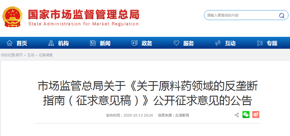 10月13日,国家市场监督管理总局发布《关于原料药领域的反垄断指南(征求意见稿)》(下称《指南》),向社会公开征求意见,时间截止10月30日。《指南》共六章22条,对原料药领域的垄断违法行为进行了十分详细的界定与规定,旨在促进原料药产业健康发展、维护原料药市场竞争秩序,保护消费者利益和社会公共利益,预防和制止原料药领域垄断行为,推进科学、有效的反垄断监管。