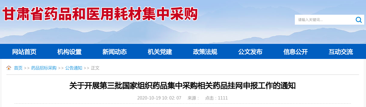 10月19日,甘肃省药品和医用耗材集中采购网发布《关于开展第三批国家组织药品集中采购相关药品挂网申报工作的通知》。