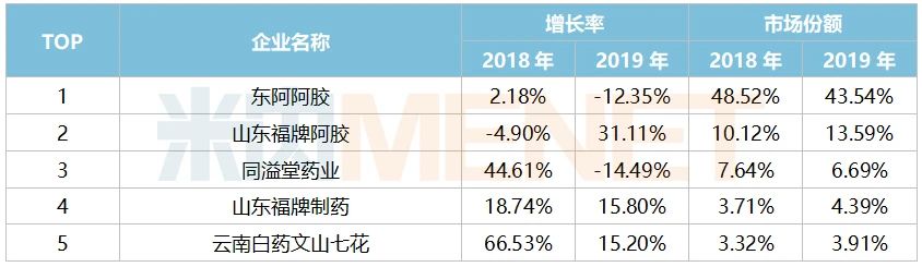 补气补血类中成药TOP5企业合揽了超七成市场,其中三家山东药企合计占62%左右,牢踞领军位置,除了东阿阿胶,山东福牌阿胶、山东福牌制药两家药企2019年增速均超过10%。