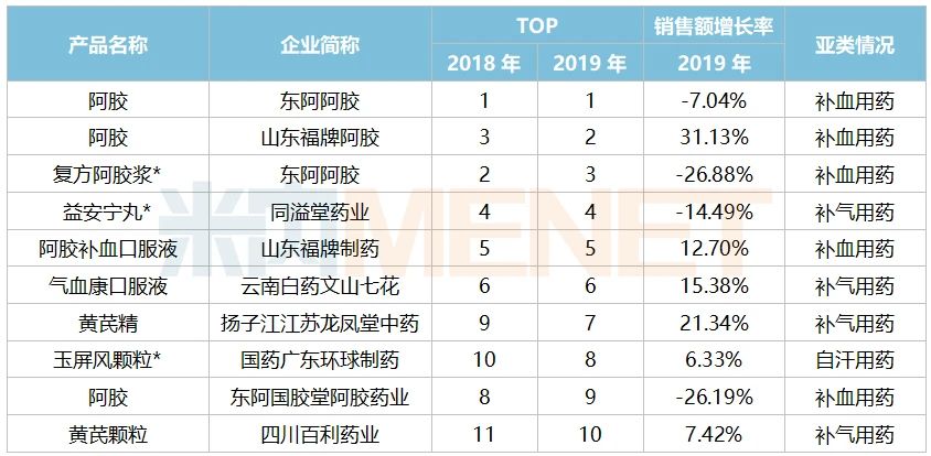在中国城市零售药店,2018年销售额过亿的补气补血类中成药品牌有12个,2019年仅剩10个,其中北京同仁堂科技制药的阿胶以及药圣堂(湖南)制药的阿胶补血口服液跌出榜单,2019年销售额分别下滑了48.97%、25.06%。