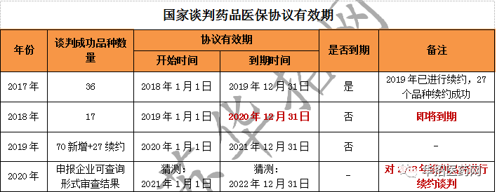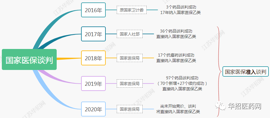 2016年至今,国家每年都会进行一轮国家药价谈判,2016年启动了第一轮,由原国家卫计委主导,最终3个药品谈判成功。2018年,国务院机构改革后,新成立的国家医疗保障局整合了多部门职责,其中就包括人社部城镇职工和城镇居民基本医疗保险、生育保险职责,在此背景下,国家医保准入谈判顺理成章的由国家医保局接手。2020年医保准入谈判也即将进入专家评审、谈判阶段,国家医保局已发布《关于2020年国家医保药品目录调整形式审查结果查询的公告》 ,申报企业可登陆“2020年国家医保药品目录调整申报系统”查询自己申报药品的形式审查结果。