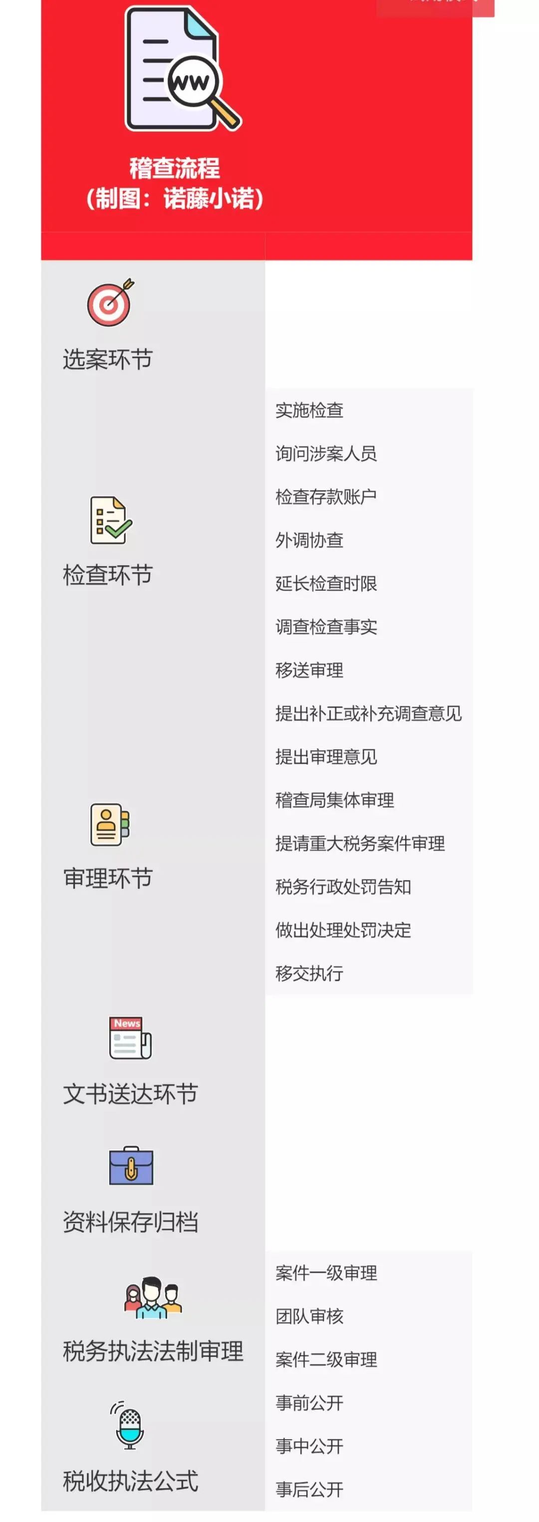 无独有偶,4月15、16日,国家税务总局广东省税务局也公布了一批重大税收违法案件企业信息,涉及企业688家,虚开金额高达41亿。5月25日,莆田税务局公布一批医疗行业公司被稽查处理 虚开发票如何查, 看看稽查局的全流程! 一、税收执法全过程记录 主要采用了文字记录对登记立案、检查取证、审理决定、送达执行、归档管理等环节进行全过程记录。 (简要整理在导图中便于理解,详细内容在图片后) (一)选案环节 局按照《税务稽查工作规程》的要求立案查处,选案部门通过《税务稽查案源审批表》《税务稽查立案审批表》《税务稽查任务通知书》等文书资料进行了文字记录。 (二)检查环节 1.实施检查:在进户调查前,为执法人员配备了执法记录仪和相机,对于取证情况和证据及时摄影摄像固定证据。执法人员预先进行实地踩点,并通过金税三期税收管理系统对涉案企业的经营情况进行了解及记录,做好事前准备。在实施检查阶段,采取统一部署、突击检查方式,全程采用执法记录仪对3户涉案企业的经营场所情况、现场人员、经营资料进行录像,对经营地址再次进行实地检查,并在经营地址现租用人或业主的见证下制作现场笔录,拍照留存,固定涉案企业走逃失联的相关证据。 2.询问涉案人员:使用《询问通知书》及《送达回证》记录通知涉案企业的财务人员、办税人员、办公场所业主接受询问及文书送达情况的相关事项;使用《询问笔录》记录被询问人的基本情况、询问地点、日期、时间、以及具体内容、被询问人核对笔录情况。 3.检查存款账户:调查涉案企业的银行存款账户和法定代表人的个人存款账户情况,发现涉案企业资金往来存在异常,与上游广西的进口报关公司无资金往来;已抵扣的进口专用缴款书即为涉案企业的全部进项,无其他购进和资金支出;在收到下游企业的货款后,当天或次日便将该笔货款全额转入深圳喜庆佳贸易有限公司账户,或以稿费、演出费等劳务收入的名义大额支付给彭丽、倪玉英等人的个人账号,不符合企业正常经营的常规资金往来。 《税务行政执法审批表》记录申请执行检查存款账户的审批过程,通过《检查存款账户许可证明》及《送达回证》记录向银行查询存款账号流水情况的过程。 4.外调协查:发函协查或派出检查人员到广西南宁海关、凭祥海关以及上游广西的进口报关公司、下游受票企业核查相关情况,外调检查发现该三间公司用于申报抵扣的广西海关进口专用缴款书对应的报关单产品信息均为进口水果(火龙果、山竹等),深圳海关的海关进口缴款书对应的报关单产品信息为旧履带式挖掘机,开具增值税专用发票给下游企业抵扣的产品信息均为电子元件或电子产品零部件,购销严重背离。 5.延长检查时限:《延长税收违法案件检查时限审批表》记录延长检查时限理由及审核审批情况。 6.确认调查事实:《税务稽查工作底稿》记录该公司的主要违法事实等。检查人员对有关问题调查取证结束后,制作《税务稽查报告》,全面反映检查过程、结果,提出对税务稽查对象税收违法或者其他涉税问题的税务处理、处罚建议及依据。 7.移送审理:《税务稽查案卷文件材料交接签收单》及《交接清单》记录检查人员与审理人员办理交接手续的情况。 (三)审理环节 1.提出补正或补充调查意见:《补正或补充调查通知书》记录需要检查部门对案件予以补正或补充调查的事项。 2.提出审理意见:审理完毕,审理人员提出审理意见,报领导审批。《税务稽查审理报告》记录案件的基本情况、检查人员查明的事实及相关证据、审理认定的事实、处理处罚意见及依据等。《税务稽查审理审批表》记录检查部门的意见、审理部门的意见及领导审核审批情况等。 3.稽查局集体审理:由于该案件拟提请重大税务案件审理委员会审理并移送公安机关处理,稽查局召开集体审理会议对该案件进行了集体审理。《税务案件集体审理纪要》记录案件简况、议定意见、主持人、出席人等情况。 4.提请重大税务案件审理:由于该案件拟移送公安机关处理,按规定提请重大税务案件审理。《重大税务案件审理提请书》记录提请理由、案件事实及证据指向、被查对象主张及其证据、定性依据及拟处理意见;《重大税务案件审理案卷交接单》《证据目录》记录稽查局与市局重大税务案件审理委员会的资料交接情况;《重大税务案件审理委员会审理意见书》记录审理委员会意见等。 5.税务行政处罚告知:审理人员制作《税务行政处罚事项告知书》,告知其作出税务行政处罚的事实、理由、依据及其依法享有的陈述、申辩、申请听证的权利。 6.作出处理处罚决定:审理人员制作《税务行政处罚决定书》情况。 7.移交执行:审理人员将文书移交执行部门送达执行,并做好签收手续。制作《税务行政执法审批表》,完成相关审批流程,然后制作《涉嫌犯罪案件移送书》将案件移送公安机关立案处理,并制作了《执行报告》。 (四)文书送达环节 chan涉案企业已走逃失联,税务登记注册的经营地址虚假且联系不上该公司的相关人员,《税务检查通知书》《税务行政处罚告知书》和《税务行政处罚决定书》等执法文书无法送达。税务机关先后采用了留置送达、邮寄送达方式,并保留了相关佐证资料,如现场执法相关记录或录像、快递回单等。在采取其它方法无法送达文