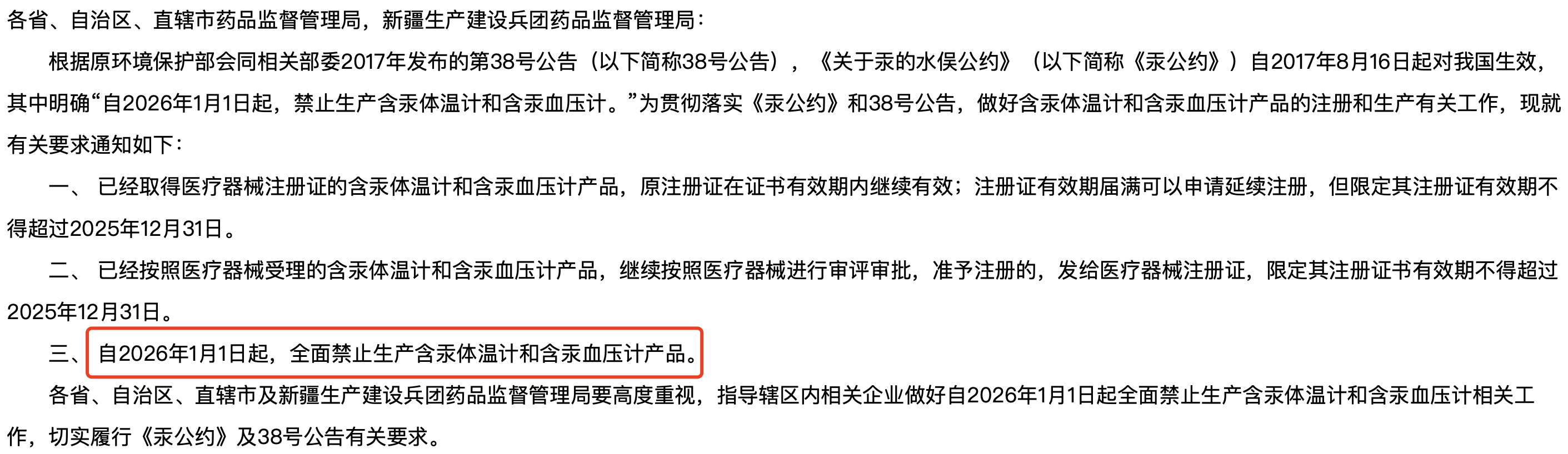 各省、自治区、直辖市及新疆生产建设兵团药品监督管理局要高度重视,指导辖区内相关企业做好自2026年1月1日起全面禁止生产含汞体温计和含汞血压计相关工作,切实履行《汞公约》及38号公告有关要求。