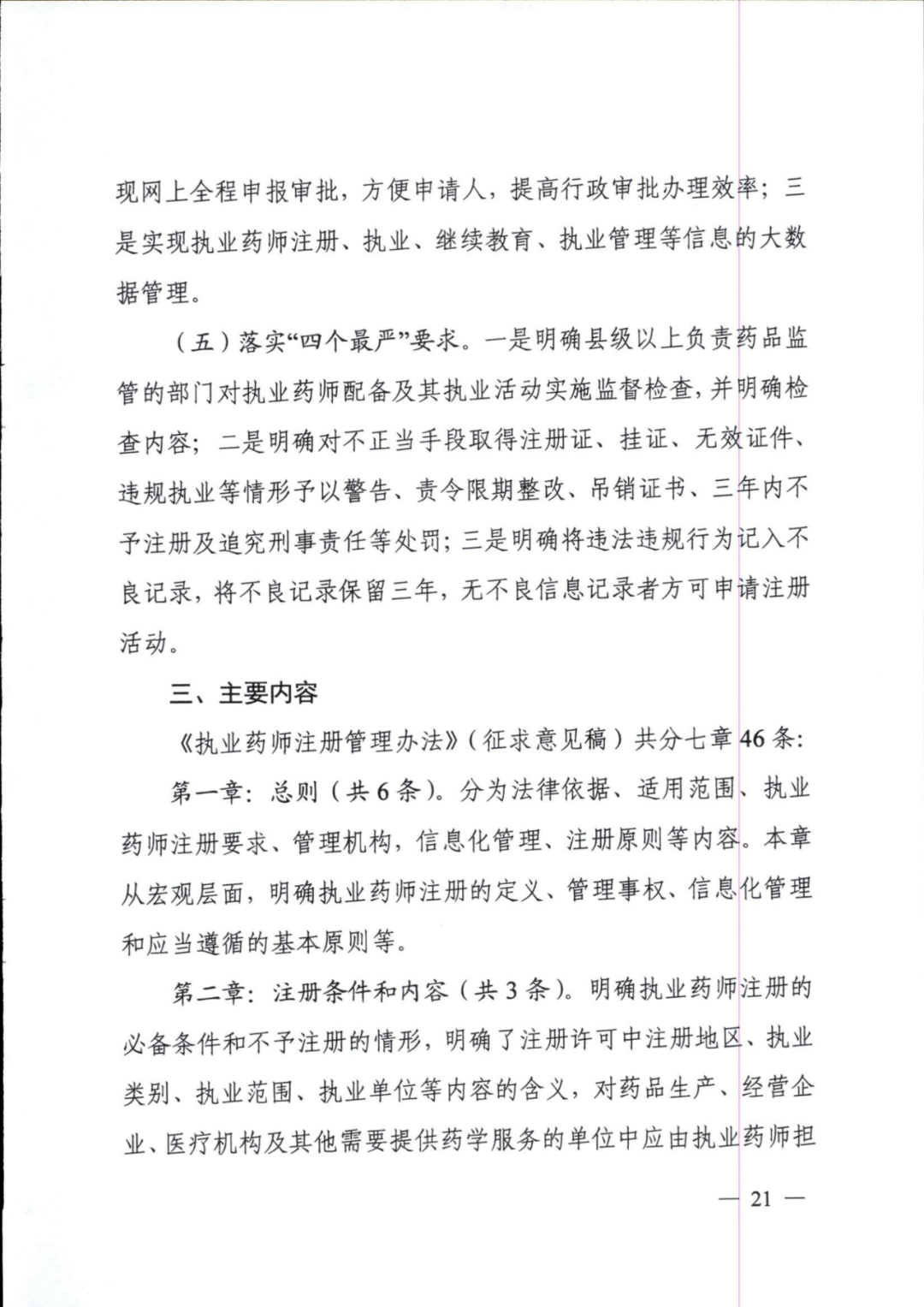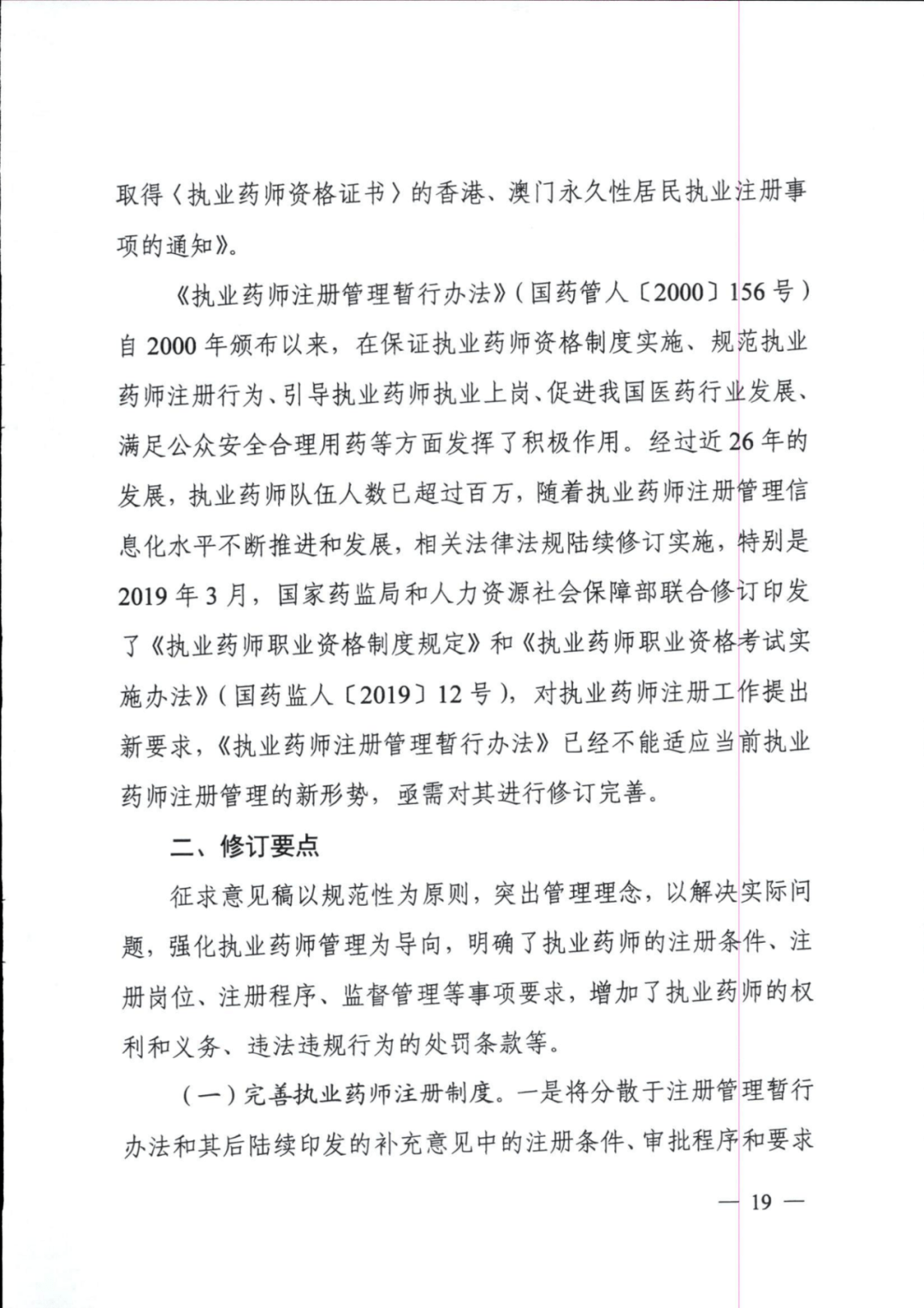 此次征求意见稿的修订要点包括,明确了执业药师的注册条件、注册岗位、注册程序、监督管理等事项要求,增加了执业药师的权利和义务、违法违规行为的处罚条款等。