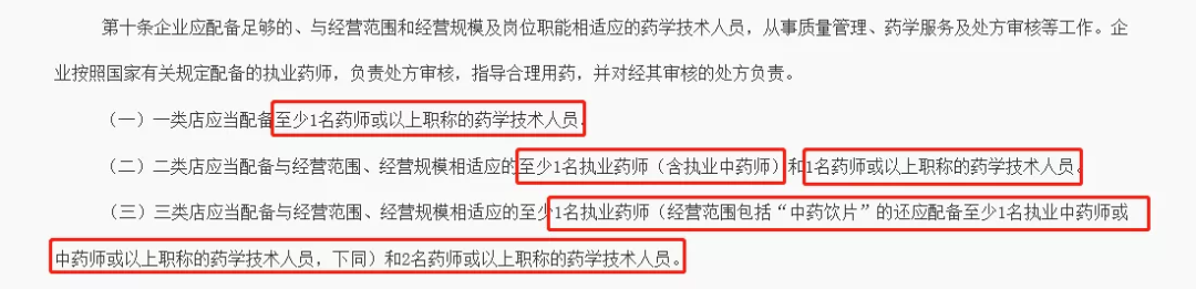 根据广东省2018年颁布的《关于药品零售企业分级分类的管理办法(试行)》,该办法中提出,经营范围包括“中药饮片”的还应配备至少1名执业中药师。这就意味着,三类店中如果有双证执业药师,可以少配备一个药学技术人员。