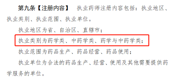 尤其值得广大执业药师注意的是,其中注册条件和内容中,第九条【注册内容】中提到:执业类别除了“药学类”、“中药学类”,还有一项“药学与中药学类”。