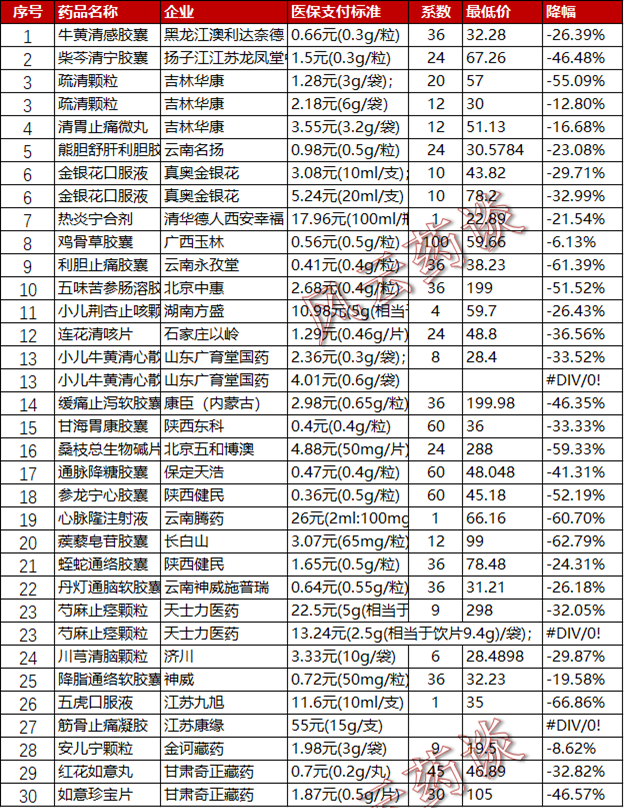 表2:中药谈判准入目录及降幅(化药、医保乙类、谈判准入)