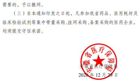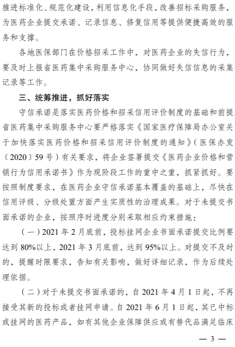 (三)自本通知印发之日起,凡参加我省药品、医用耗材及临床检验试剂等集中带量采购、挂网采购、备案采购的医药企业,均须提交守信承诺。