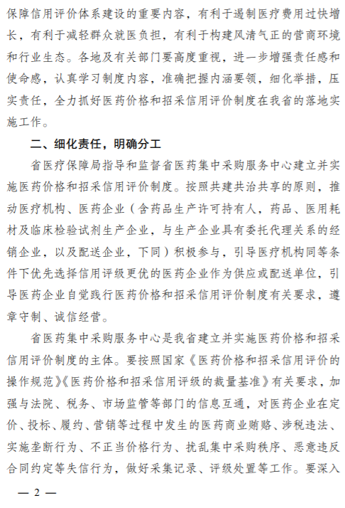省医疗保障局指导和监督省医药集中采购服务中心建立并实施医药价格和招采信用评价制度。按照共建共治共享的原则,推动医疗机构、医药企业(含药品生产许可持有人,药品、医用耗材及临床检验试剂生产企业,与生产企业具有委托代理关系的经销企业,以及配送企业,下同)积极参与,引导医疗机构同等条件下优先选择信用评级更优的医药企业作为供应或配送单位,引导医药企业自觉践行医药价格和招采信用评价制度有关要求,遵章守制、诚信经营。