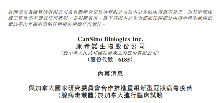 今日,康希诺生物发布公告称,公司与加拿大国家研究委员会展开合作,共同推进重组公共卫生事件疫苗(腺病毒载体)在加拿大的临床试验。该临床研究从临床I/II期开始,目标为开展临床III期,以最快速度证明疫苗的临床保护效力。