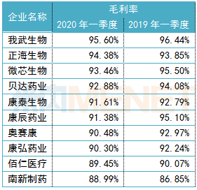 毛利率TOP10药企中,我武生物、贝达药业、康辰药业、奥赛康等8家均超过90%,其中,我武生物高达95.60%。