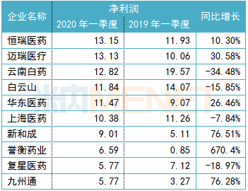 医药企业2020年一季度净利润TOP10(单位:亿元)